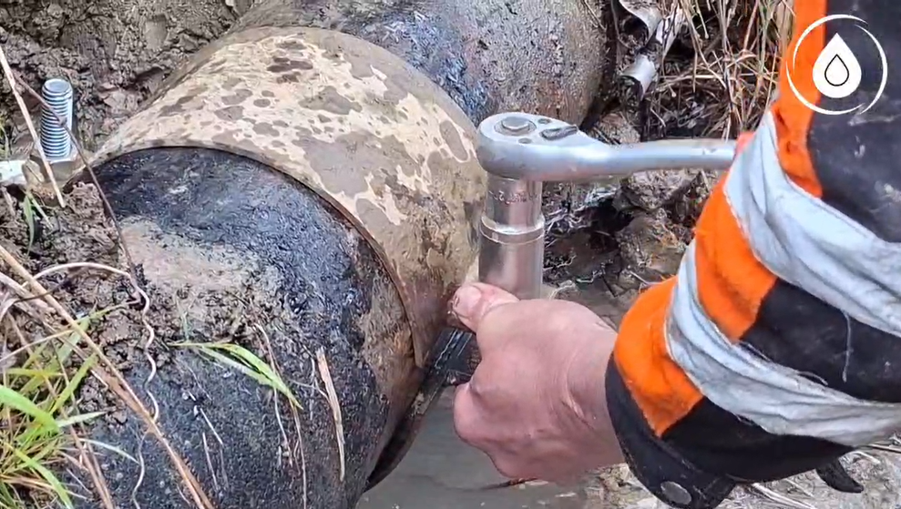 В данный момент производится установка хомута на поврежденном участке сети.