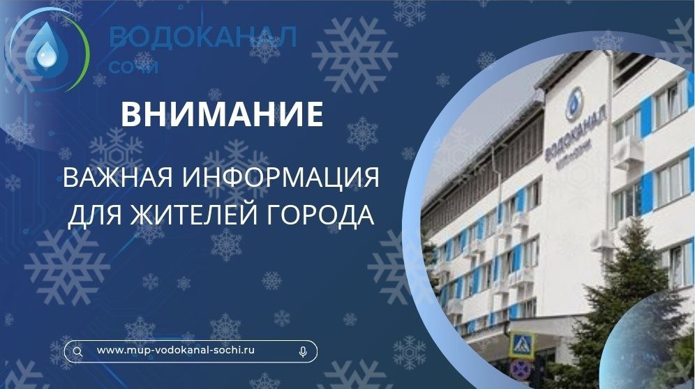 УВАЖАЕМЫЕ ГРАЖДАНЕ! В НАСТОЯЩЕЕ ВРЕМЯ УЧАСТИЛИСЬ СЛУЧАИ МОШЕННИЧЕСКИХ ДЕЙСТВИЙ СО СТОРОНЫ ЛИЦ, ПРЕДСТАВЛЯЮЩИХСЯ СОТРУДНИКАМИ МУП Г. СОЧИ «ВОДОКАНАЛ», ЦЕЛЬ ДАННЫХ ДЕЙСТВИЙ — ВЫМОГАТЕЛЬСТВО ДЕНЕЖНЫХ СРЕДСТВ НА ЯКОБЫ «ЗАКОННЫХ» ОСНОВАНИЯХ, НИ В КОЕМ СЛУЧАЕ НЕ ПЕРЕДАВАЙТЕ СВОИ ДЕНЕЖНЫЕ СРЕДСТВА ДАННЫМ ЛИЦАМ, ПРОВЕРЯЙТЕ ДОКУМЕНТЫ У СОТРУДНИКОВ ОБРАТИВШИХСЯ К ВАМ ПО ВОПРОСАМ ВОДОСНАБЖЕНИЯ И ВОДООТВЕДЕНИЯ.