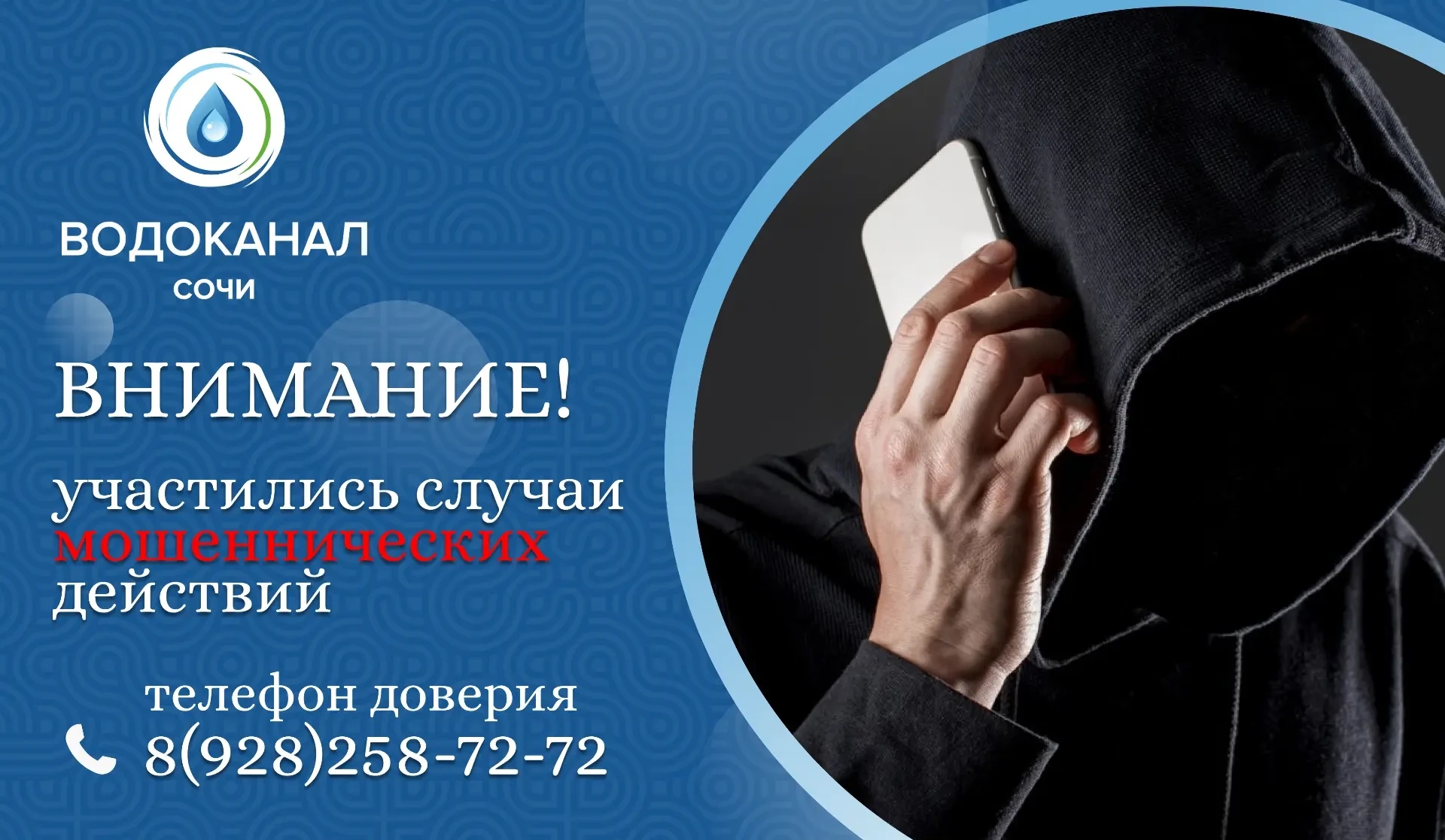 УЧАСТИЛИСЬ СЛУЧАИ МОШЕННИЧЕСКИХ ДЕЙСТВИЙ СО СТОРОНЫ ЛИЦ, ПРЕДСТАВЛЯЮЩИХСЯ СОТРУДНИКАМИ МУП Г. СОЧИ «ВОДОКАНАЛ».