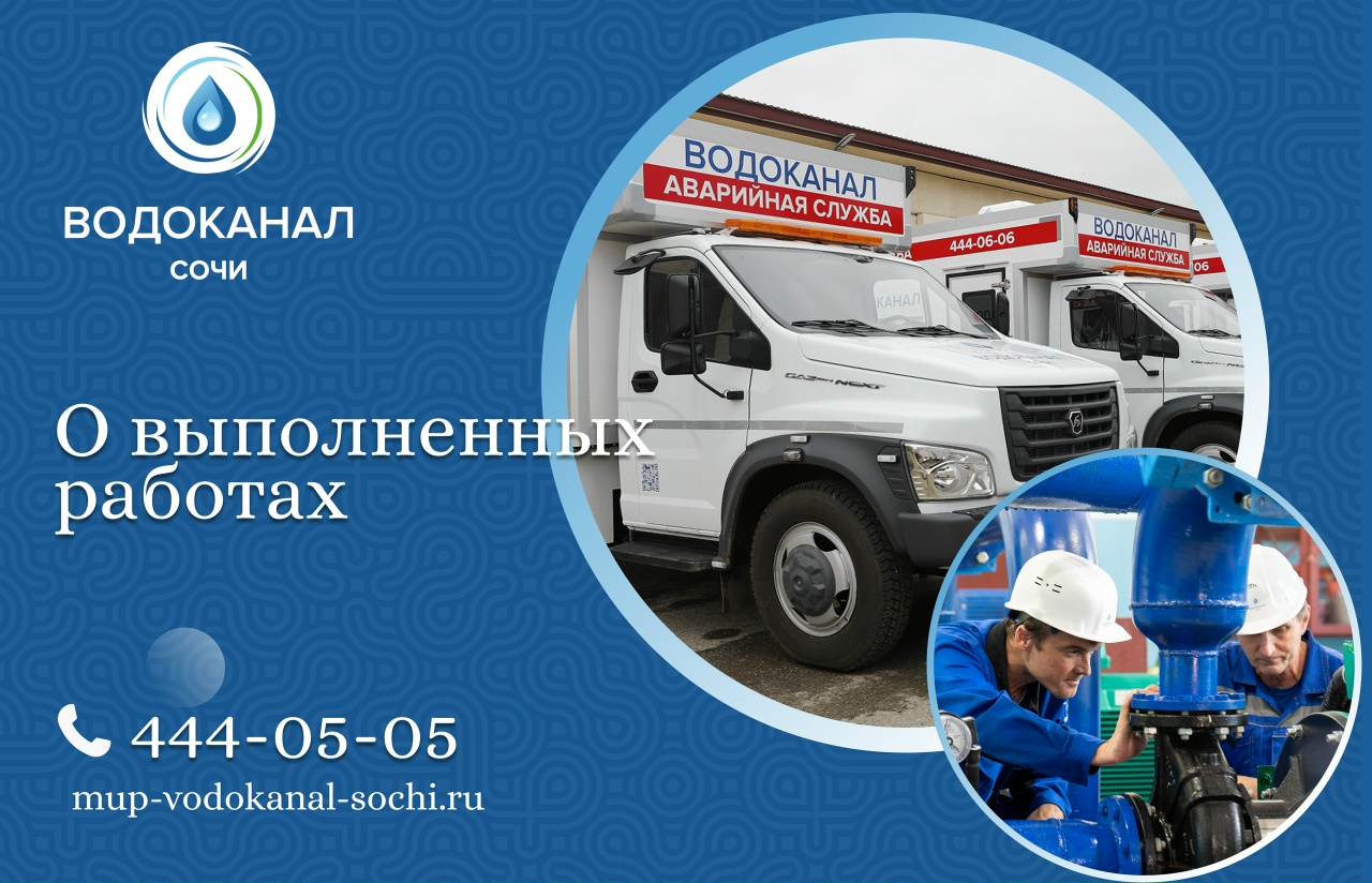 Центральный и Хостинский район - ул. Конституции 34, устранена трещина на трубопроводе Ду500 - ул. Малоахунский проезд 7, устранена трещина на трубопроводе Ду150 - ул. Шоссейная 5Б, устранен свищ на трубопроводе Ду50 - ул. Сухумское шоссе 19/4, устранена трещина на трубопроводе Ду15 - пер. Виноградный 9, замена ЗРА на трубопроводе Ду200 - ул. Московская 17, замена максиадаптера на трубопроводе Ду100 - ул. Чекменева 33, устранен свищ на трубопроводе Ду50 - ул. Железнодорожная 2, (причал) устранен свищ на трубопроводе Ду50 - ул. Крымская 25/22, устранена трещина на трубопроводе Ду16 - ул. Восточная 18, устранена трещина на трубопроводе Ду50 - ул. Коммунальная 73, устранена трещина на трубопроводе Ду200 - ул. Санаторная 21, устранена трещина на трубопроводе Ду40 - ул. Альпийская 18, устранена трещина на трубопроводе Ду200
