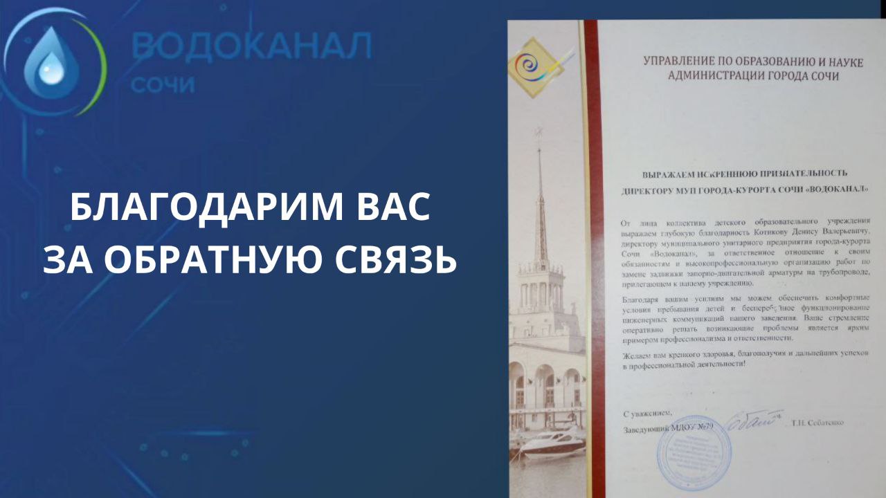 Коллектив детского сада расположенного в Центральном районе поблагодарил коллектив предприятия за оперативное реагирование в части проведения аварийно-восстановительных работ на сети водоснабжения. В ходе работ была произведена замена запорно-регулирующей арматуры на трубопроводе прилегающем к учреждению дошкольного образования.